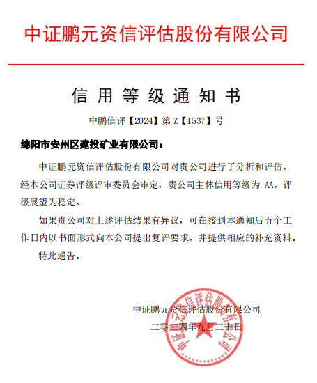 信用評級是企業(yè)在資本市場上的“身份證”,也是企業(yè)綜合實力和信譽的重要體現(xiàn)。近年來,在安州區(qū)委、區(qū)政府、區(qū)國資辦的帶領(lǐng)下,建投礦業(yè)規(guī)模效益穩(wěn)步提升、業(yè)務領(lǐng)域不斷拓展、改革不斷深化、監(jiān)管體系不斷完善,較好完成各項目標任務。此次獲評不僅是對建投礦業(yè)管理水平、資產(chǎn)結(jié)構(gòu)、經(jīng)營效益等工作的高度認可,也是對安州區(qū)推動國有企業(yè)改革工作的充分肯定。